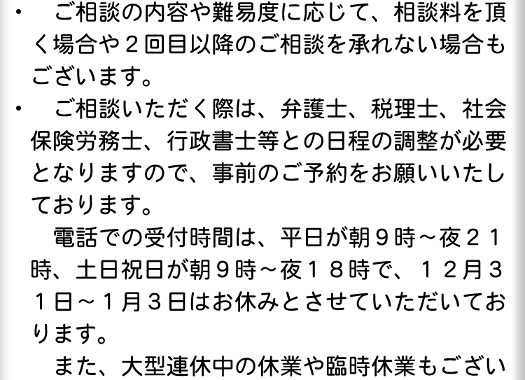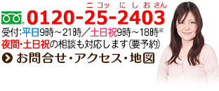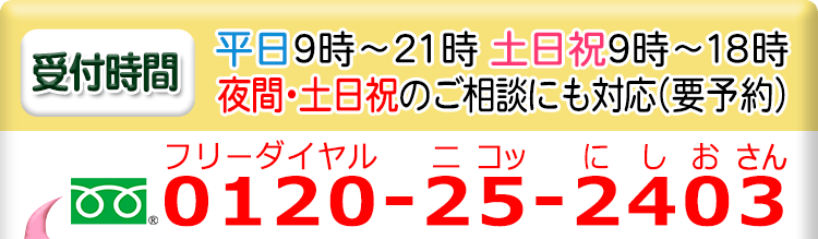 フリーダイヤルは、平日は21時、土日祝日は18時まで対応しています。メールフォームからもご連絡いただけますので、どうぞお気軽にお問い合わせください。