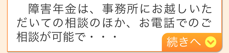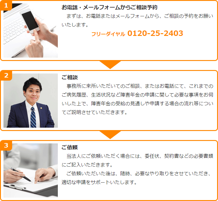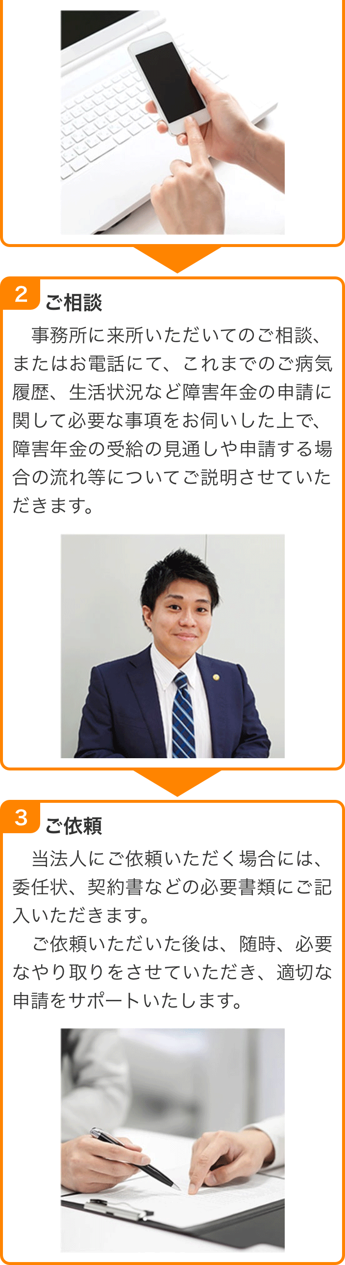 障害年金について当事務所へご相談いただく際の流れをこちらでご案内しています。障害年金のご相談は、事務所でも電話でも可能です。