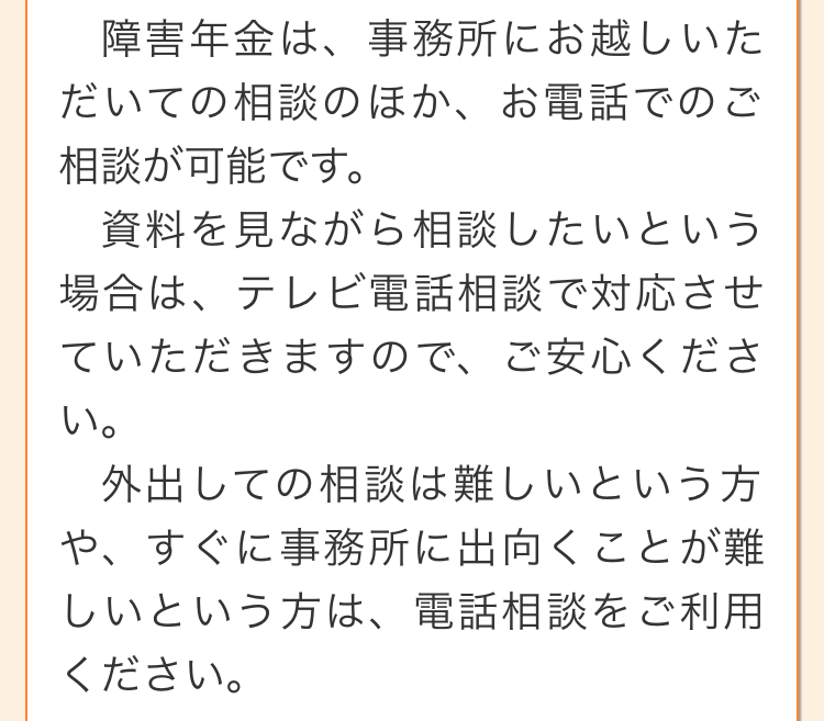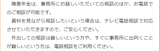 障害年金のご相談を、電話やテレビ電話によって、ご自宅に居ながら気軽にご相談いただけるため、札幌やその周辺にお住まいの方にも気軽にご相談いただけるかと思います。