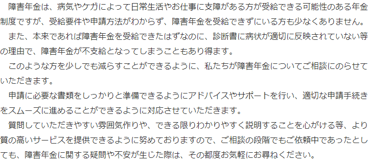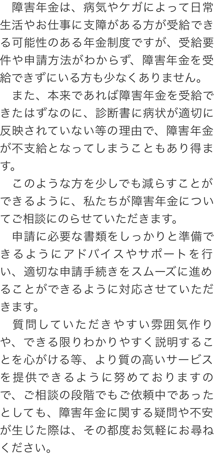 トップその他初めて障害年金を申請の方へ 階層構造▼ その他(目次) 初めて障害年金を申請の方へ その他(目次)その他トップ共通バナー※消さない障害年金無料診断サービス初めて障害年金を申請の方へ手続きの流れ代表・所長メッセージ電話・テレビ電話相談について電話・テレビ電話相談の流れ心グループニュース(新着情報)お客様相談室費用の安さにこだわる理由関連リンクプライバシーポリシー 受付時間 平日 9時~21時、土日祝 9時~18時 夜間・土日祝の相談も対応します (要予約) 所在地 〒060-0808 北海道札幌市北区北八条西4‐1-1パストラルビルN8 2F 0120-25-2403 お問合せ・アクセス・地図
