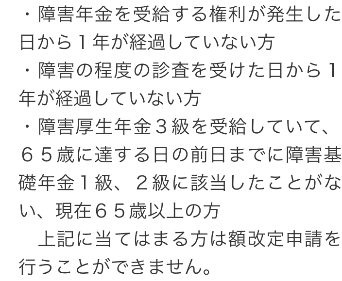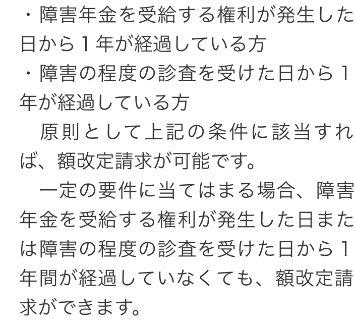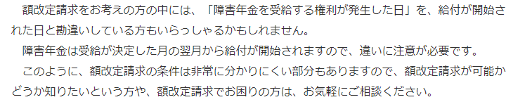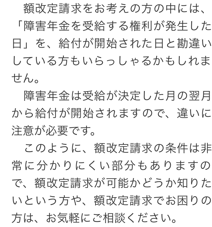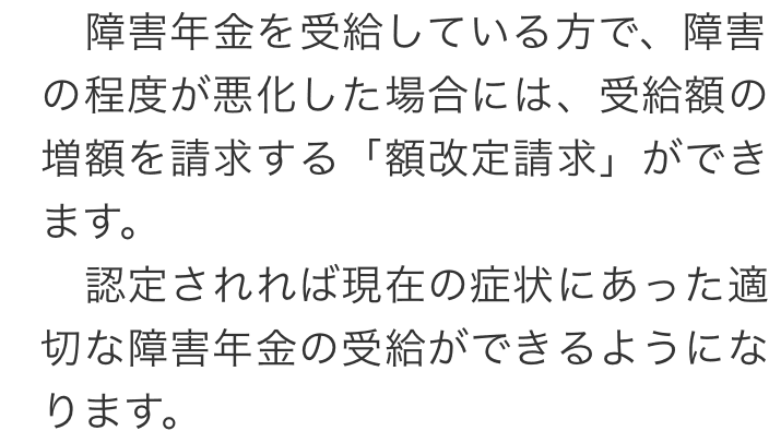 トップお役立ち情報額改定請求について 階層構造▼ お役立ち情報(目次) 額改定請求について1 額改定請求とは2 額改定請求ができるパターン3 額改定請求ができないパターン4 額改定請求に関してお困りの方へ 1 額改定請求とは2 額改定請求ができるパターン3 額改定請求ができないパターン4 額改定請求に関してお困りの方へ お役立ち情報(目次)お役立ち情報トップ障害年金を受給するためのポイント障害年金で必要な書類障害年金申請が不支給になった時の対応について不支給通知が届いた場合働きながら障害年金を受給できる場合家族に気付かれないように障害年金を受給することはできるのか精神疾患について障害年金が認められる基準障害年金の種類額改定請求について障害者手帳について 受付時間 平日 9時~21時、土日祝 9時~18時 夜間・土日祝の相談も対応します (要予約) 所在地 〒060-0808 北海道札幌市北区北八条西4‐1-1パストラルビルN8 2F 0120-25-2403 お問合せ・アクセス・地図